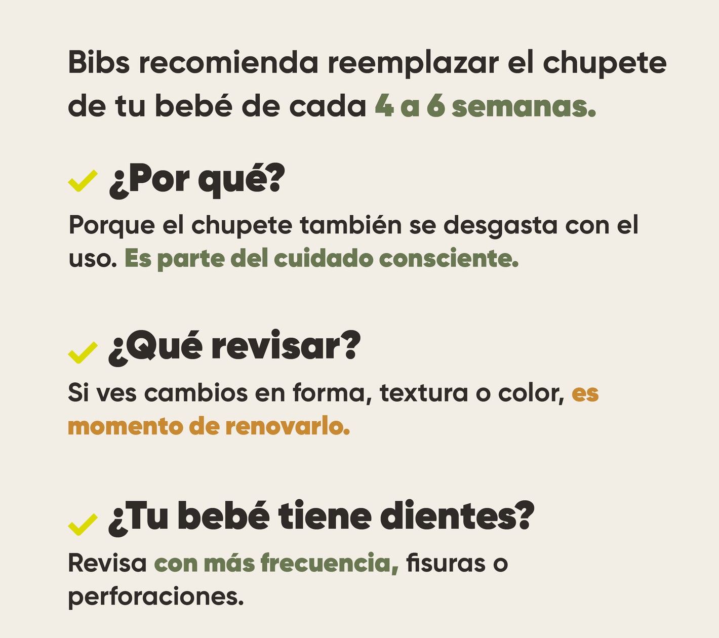 Las tetinas de BIBS están hechas de látex natural, un material orgánico que puede presentar ligeras variaciones en tono y transparencia. Esto es completamente normal y se debe a las propiedades naturales del látex, que reaccionan de forma distinta según factores como la luz, el calor y el tiempo de uso.